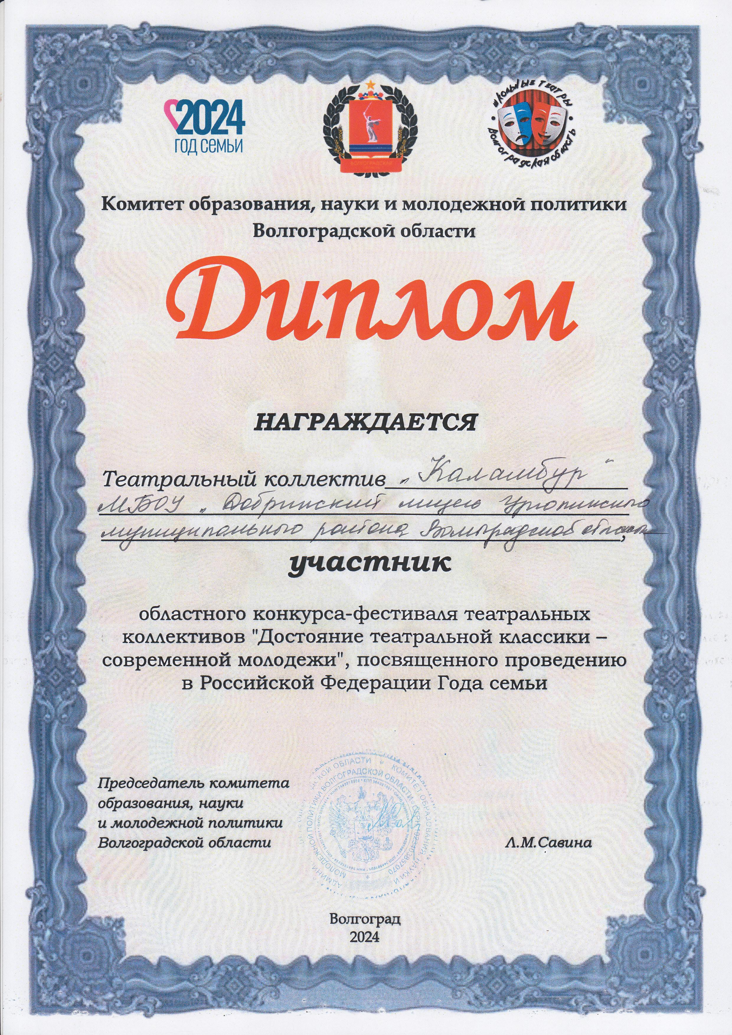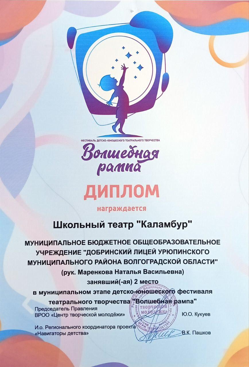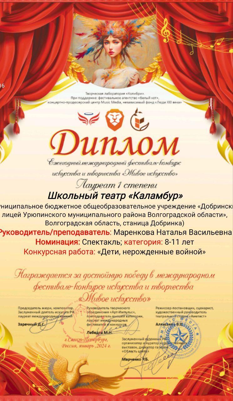 21 февраля 2023 года школьный наш театр "Каламбур" принял участие в VII региональном краеведческом фестивале "Сохраним наследие" в номинации "Я расскажу вам о войне" (театральной) Фестиваль был проведён в городе Михайловке Волгоградской области очно и посвящен 80-летию Победы в Сталинградской битве. Из 11 коллективов, участвовавших в этой номинации, наш театр завоевал 2 место. Жюри по достоинству оценило игру молодых актеров, учащихся 5 класса: Комбарова Артёма, Степаненко Василисы, Гофман Кати, Самардак Миланы и Давыдовой Ани, ученицы 8 класса.