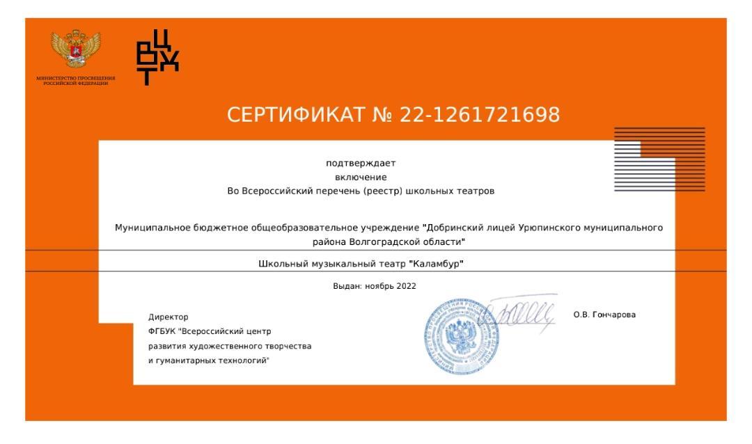 Своими талантами и творческими способностями дети несут радость людям, участвуют в конкурсах разной значимости, что стимулирует их к новым достижениям. Театр вообще особый мир в пространстве образовательного учреждения. Театральная деятельность открывает детям и подросткам путь в общечеловеческую культуру, к нравственным и духовным ценностям, патриотизму. Дает умение общаться и презентовать себя как личность, развивает творческие задатки, раскрепощает, помогает стать развитой гармоничной личностью. В сентябре 2022 школьный музыкальный театр "Каламбур" возобновил свою деятельность в новом составе и с новыми творческими задумками. Пока в Театре 15 актеров, учащихся 5-6 классов. Руководит театром как и прежде Маренкова Наталья Васильевна, старший методист, педагог высшей категории.